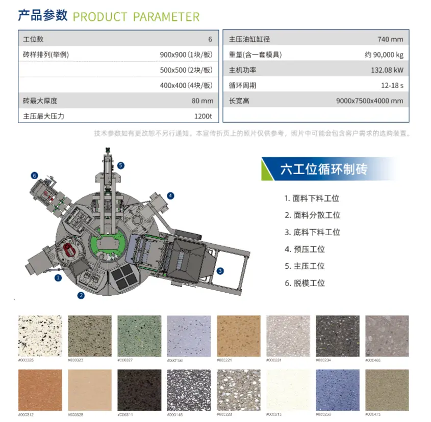 সরঞ্জামগুলির প্রধান চাপ একটি বড়-ব্যাসের ট্রানজিশন তেল ট্যাঙ্ক ভর্তি ডিভাইস গ্রহণ করে, যা দ্রুত প্রতিক্রিয়া জানাতে পারে, সংবেদনশীলভাবে সরাতে পারে এবং 1,200 টন চাপ দিতে পারে। হাইড্রোলিক স্টেশন একটি পরিবর্তনশীল পাম্প গ্রহণ করে, যা একটি আনুপাতিক ভালভের মাধ্যমে গতি এবং চাপ সামঞ্জস্য করে, যা শক্তি-সাশ্রয়ী এবং পরিচালনা করা সহজ। টার্নটেবল একটি অতি-বড় স্লিউইং বিয়ারিং গ্রহণ করে, যা একটি এনকোডার সহ একটি সার্ভো মোটর দ্বারা নিয়ন্ত্রিত হয় এবং এতে স্থিতিশীল অপারেশন এবং সুনির্দিষ্ট নিয়ন্ত্রণ রয়েছে। একই সময়ে, এটি একটি উন্নত ভিজ্যুয়াল নিয়ন্ত্রণ ব্যবস্থা গ্রহণ করে এবং পিএলসি সিমেন্স S7-1500 সিরিজ গ্রহণ করে। উপাদান আনলোডিং ডিভাইসটিতে একটি অন্তর্নির্মিত আলোড়নকারী ডিভাইস রয়েছে এবং আনলোড করার জন্য একটি পরিমাণগত টার্নটেবল ব্যবহার করা হয় এবং উপাদানের পরিমাণ সঠিক এবং স্থিতিশীল।